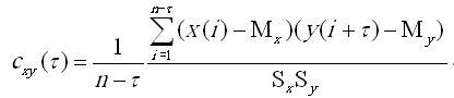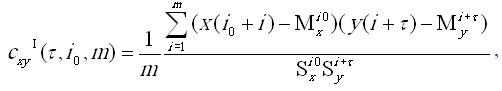 Интервальная корреляция. Интервальная корреляционная функция cxyI(t,i0,m) представляет собой последовательность коэффициентов корреляции Пирсона, вычисленных между фиксированным отрезком первого ряда заданного размера m и начального положения i0 и равноразмерными отрезками второго ряда, выбранных с последовательными сдвигами t от начала ряда.