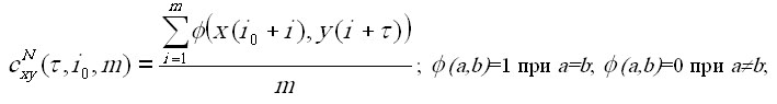 Номинальная корреляция. Номинальная корреляция cxyN(t,i0,m) является мерой коррелированности номинальных временных рядов (значениями которых являются не числа, а символы). Если при вычислении обычной количественной корреляции для каждой пары значений двух выбранных для анализа переменных вычисляется произведение разностей каждого значения и среднего значения этой переменной, то для номинальной корреляции берется значение единица при совпадении пары значений (символов) и значение ноль при несовпадении пары значений. Примерами подобных рядов могут служить генетические структуры, шифрограммы и т. п.