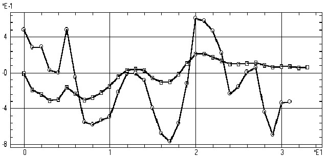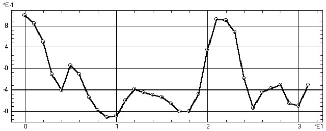 Продолжение анализа. Построим теперь интервальную кросскорреляционную функцию, отражающую влияние процесса dol на процесс fut. Для сравнения вычислим также и классическую корреляционную функцию, а для большей наглядности совместим их числовые выдачи и графики.