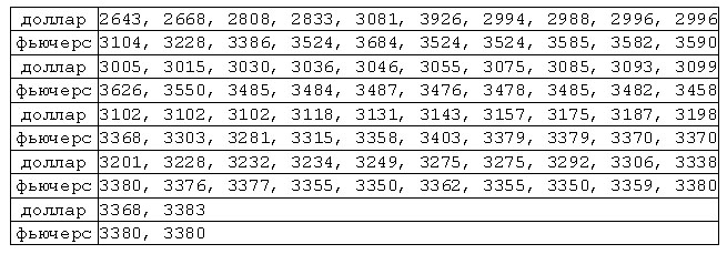 З а д а ч а. Некая коммерческая фирма уделяла важное внимание работе на рынке фьючерсных контрактов. Поэтому для выработки обоснованной стратегии желательно понимание динамики фьючерсного курса и его несомненной связи с текущим курсом доллара. Для этого используются (табл.1) результаты долларовых торгов на ММВБ в период с 3.10.94 по 15.12.94 и результаты фьючерсных долларовых торгов с поставкой 15.12.94 (торги производятся каждый день, исключая субботу и воскресенье).