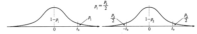 Направленные и ненаправленные гипотезы. Статистические гипотезы могут быть направленными или односторонними (например, Н1:r>0 — «коэффициент корреляции больше нуля» или Н1:M1>M2 — «среднее значение выборки 1 больше среднего значения выборки 2») и ненаправленными или двусторонними (например, Н1:r<>0 или Н1:M1<>M2). Тип используемой альтернативы зависит от метода проверки гипотезы. Однако от типа альтернативы зависит расположение критической области и уровень значимости нулевой гипотезы. Так распределение значений критерия проверки однонаправленной гипотезы (рис. 5.4, а) имеет одну критическую область, а распределение значений критерия проверки ненаправленной гипотезы (рис. 5.4, б) имеет две критические области. Соответственно для одного и того же значения критерия t (рис. 5.3) соответствующий уровень значимости для однонаправленной гипотезы будет в 2 раза меньше, чем для ненаправленной гипотезы.